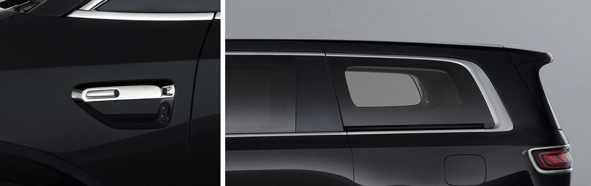车身侧面造型舒展,车窗使用了全框式的镀铬压条装饰,后侧窗后部镀铬饰条加宽,侧滑门的隐藏式滑轨位于后侧窗底部。车门把手使用了传统外拉式,并且带有镀铬装饰,车身底部下包围上也使用了镀铬装饰。尺寸方面,新车的长宽高分别为5359/2009/1879mm,轴距3250mm。