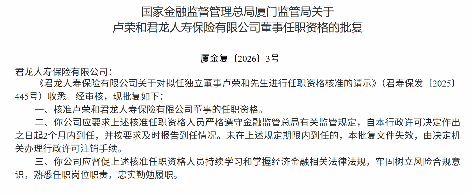 1月30日,国家金融监督管理总局厦门监管局发布关于卢荣和君龙人寿保险有限公司董事任职资格的批复,核准卢荣和君龙人寿保险有限公司董事的任职资格。
